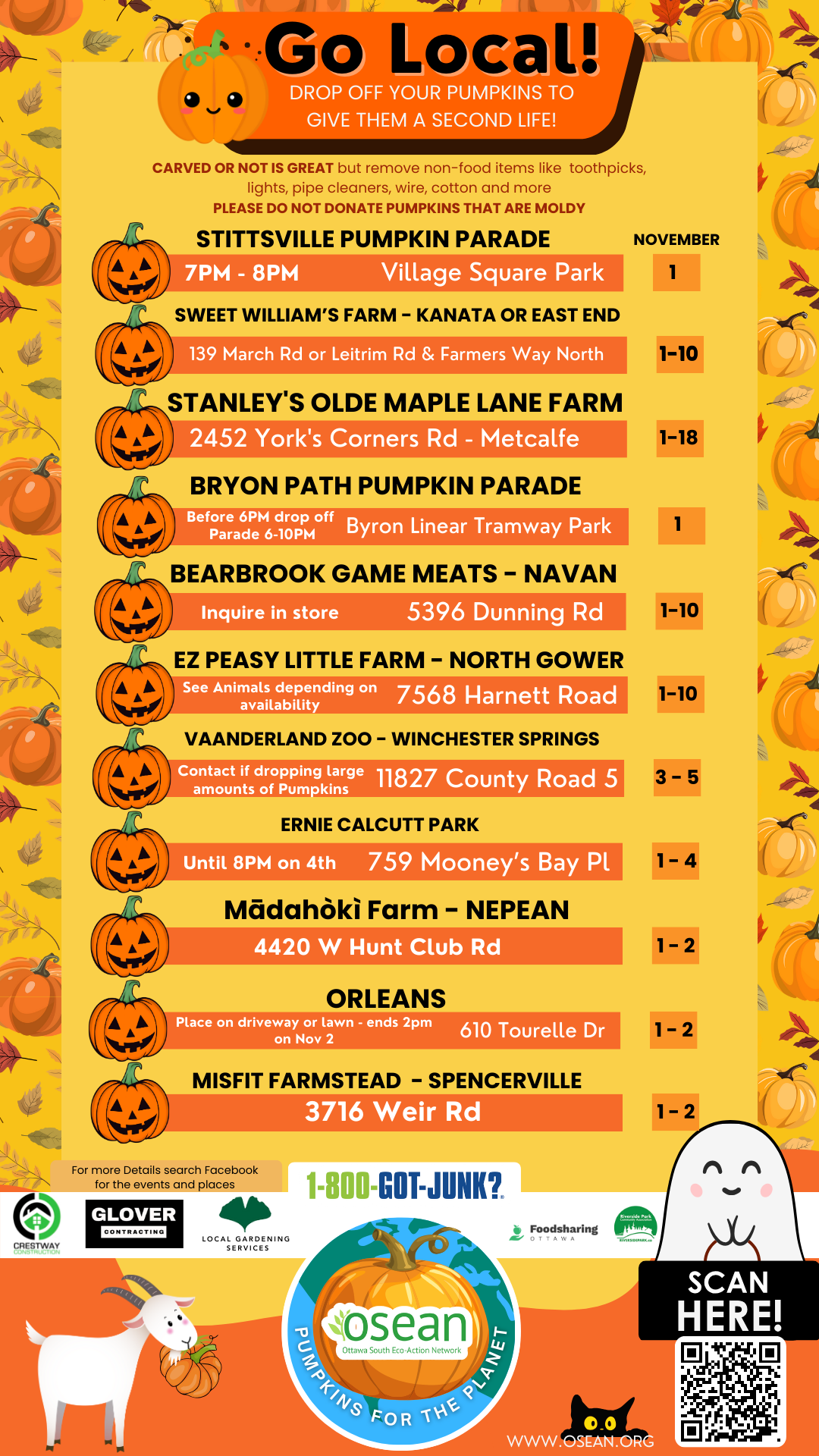 OSEAN organizes a big pumpkin collection drive in Ottawa South (River, Alta Vista and Gloucester-Southgate Wards) each year to divert pumpkins from the landfill and organic waste facilities. Click here to see the map of OSEAN-organized drop-off sites. If you live outside of Ottawa South and would like to divert your pumpkins, there are numerous other locations around the city that accept pumpkins. One may be near you!