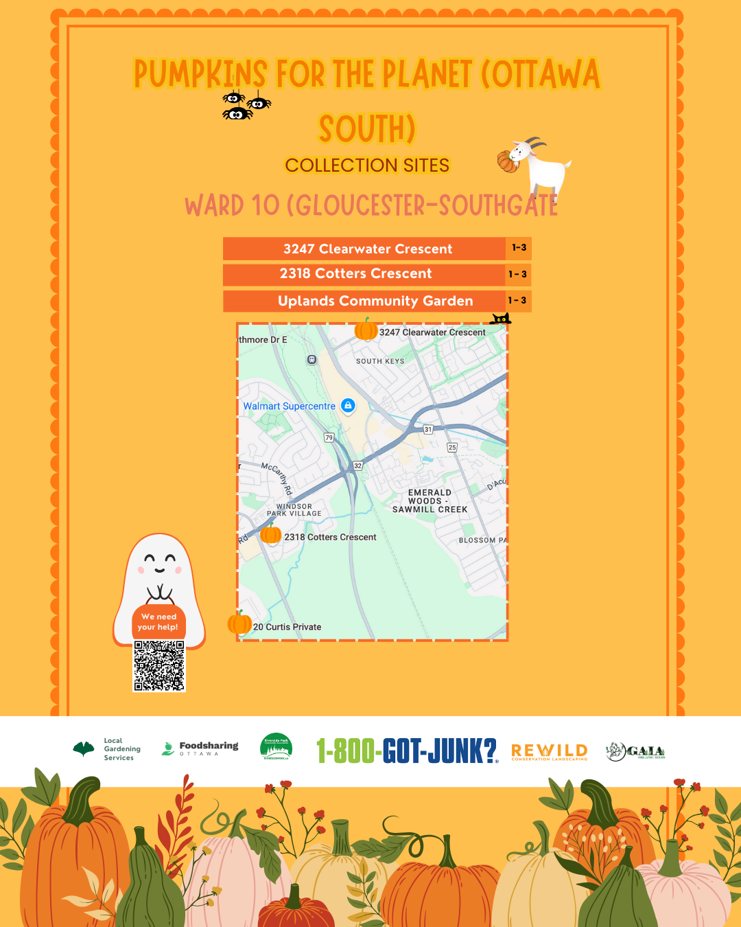 Local collection sites will be open until November 3rd at 2 p.m. After that, you can drop off to “Pumpkin Alley” (Ernie Calcutt Park at 759 Mooney’s Bay Place) until Wednesday November 6th at 5 p.m.
