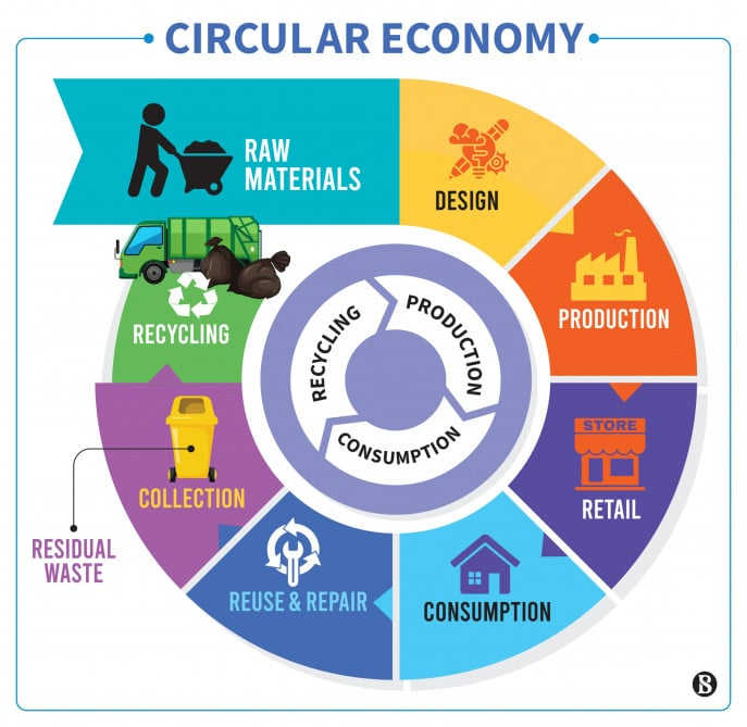 Raw materials are designed, then produced, then sold, then consumed, then reused / repaired, then collected, then recycled. The key of “circular economy” is adding the steps after consumption, as well as having recycling as the primary stream for end of lifecycle items.